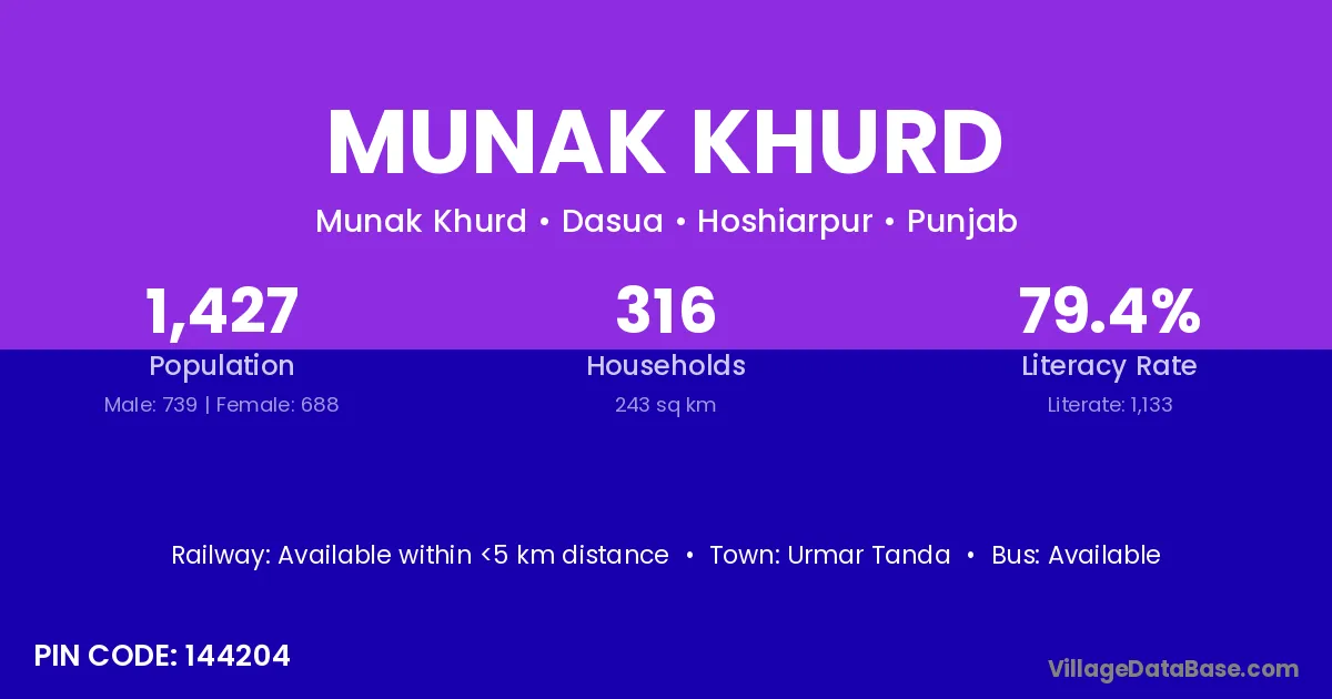 Urmar Tanda is the nearest town to Munak Khurd village for major economic activities
