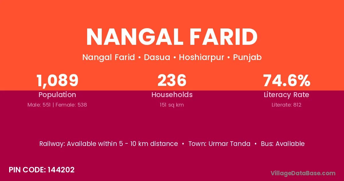 Nangal Farid village has a total population of 1,089 people, of which 551 are males and 538 are females.