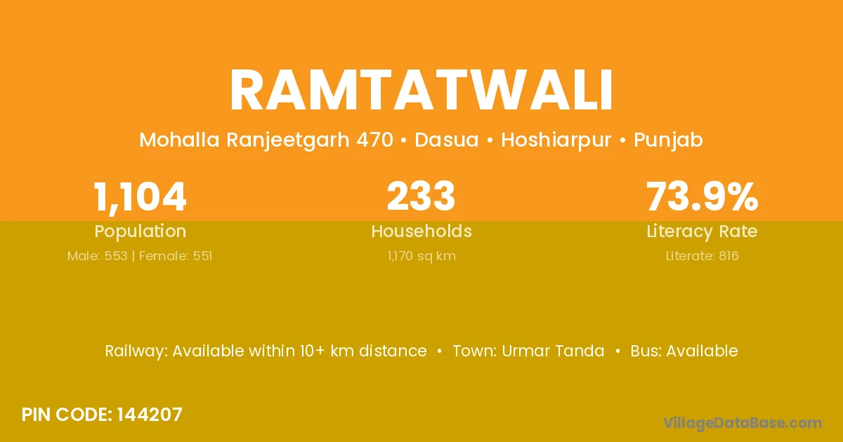 Ramtatwali village has a total population of 1,104 people, of which 553 are males and 551 are females.