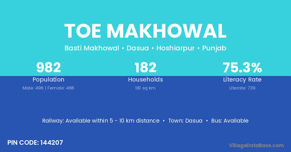 Toe Makhowal village has a total population of 982 people, of which 496 are males and 486 are females.