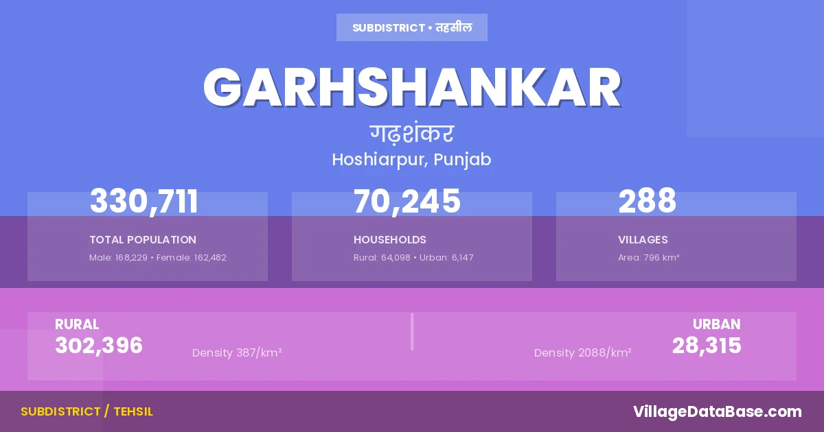 According to the 2011 census The total area of Garhshankar Tehsil is 796 km², with a population of 330711 people. The population density is 416 inhabitants per square kilometre, and there are approximately 70245 houses in the sub district.