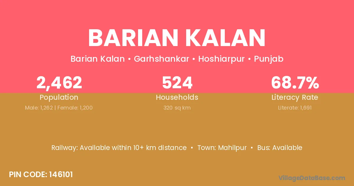 Barian Kalan village has a total population of 2,462 people, of which 1,262 are males and 1,200 are females.