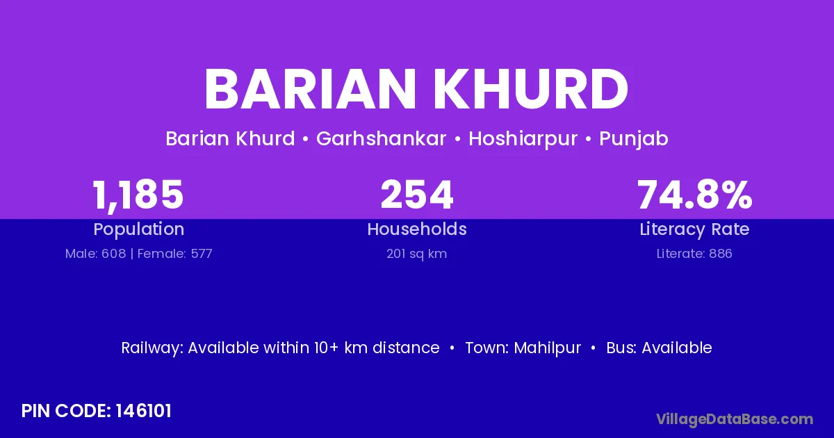 Barian Khurd village has a total population of 1,185 people, of which 608 are males and 577 are females.