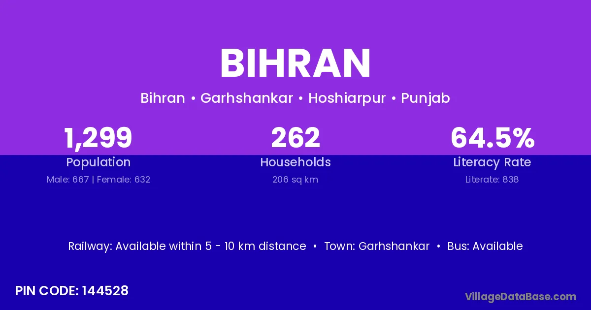 Bihran village has a total population of 1,299 people, of which 667 are males and 632 are females.