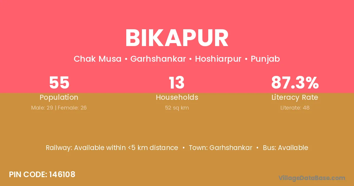 Bikapur village has a total population of 55 people, of which 29 are males and 26 are females.