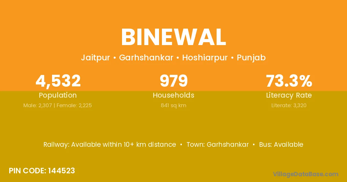 Garhshankar is the nearest town to Binewal village for major economic activities