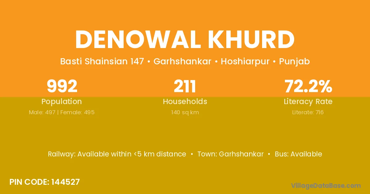 Denowal Khurd village has a total population of 992 people, of which 497 are males and 495 are females.