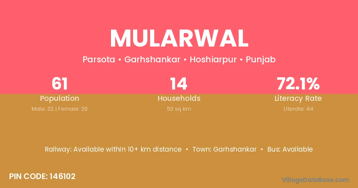 Mularwal village has a total population of 61 people, of which 32 are males and 29 are females.