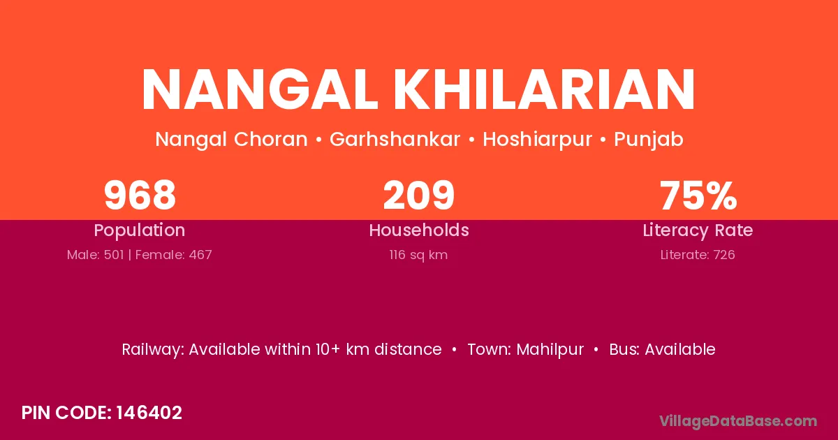 Nangal Khilarian village has a total population of 968 people, of which 501 are males and 467 are females.