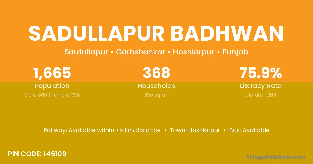 Sadullapur Badhwan village has a total population of 1,665 people, of which 869 are males and 796 are females.