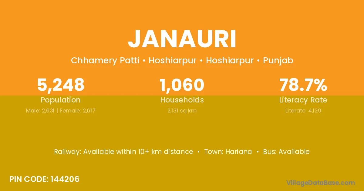 Janauri village has a total population of 5,248 people, of which 2,631 are males and 2,617 are females.