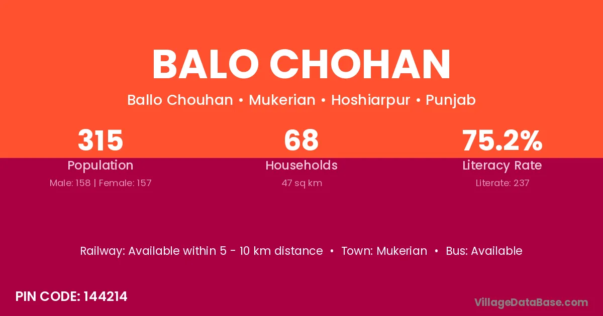 Balo Chohan village has a total population of 315 people, of which 158 are males and 157 are females.