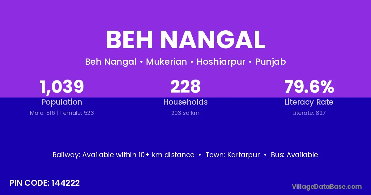 Beh Nangal village has a total population of 1,039 people, of which 516 are males and 523 are females.