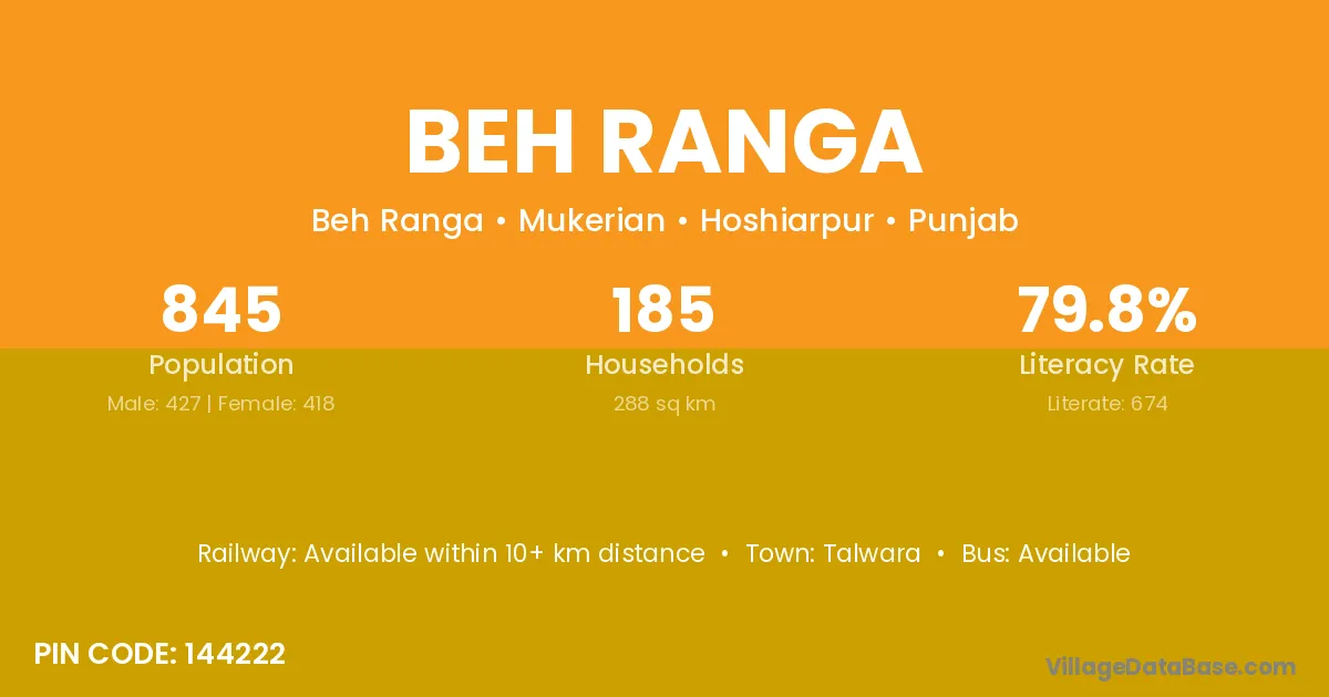 Beh Ranga village has a total population of 845 people, of which 427 are males and 418 are females.