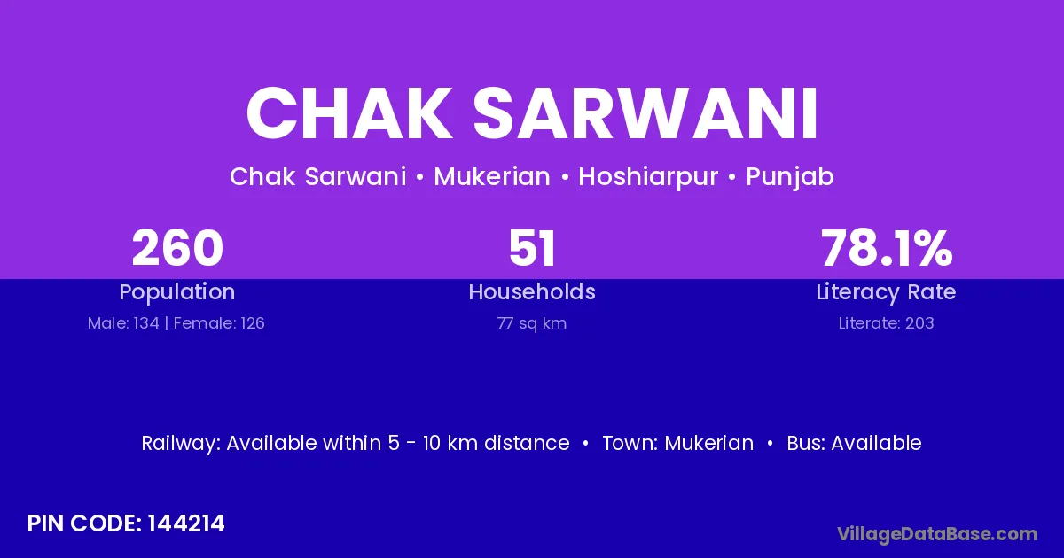 Chak Sarwani village has a total population of 260 people, of which 134 are males and 126 are females.