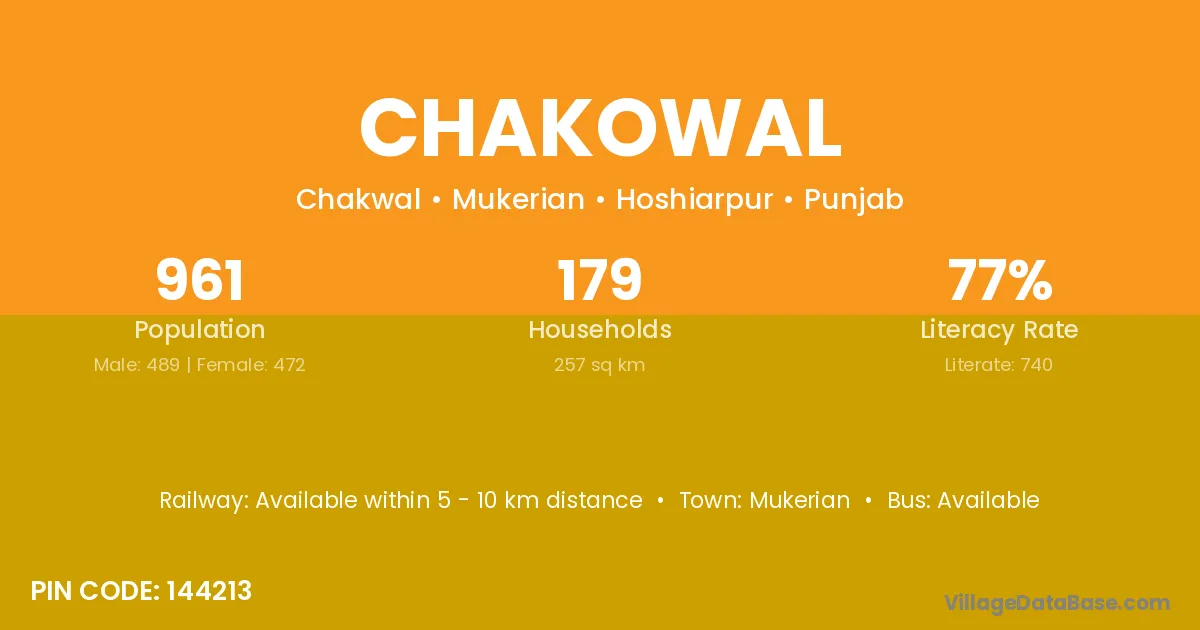 Chakowal village has a total population of 961 people, of which 489 are males and 472 are females.