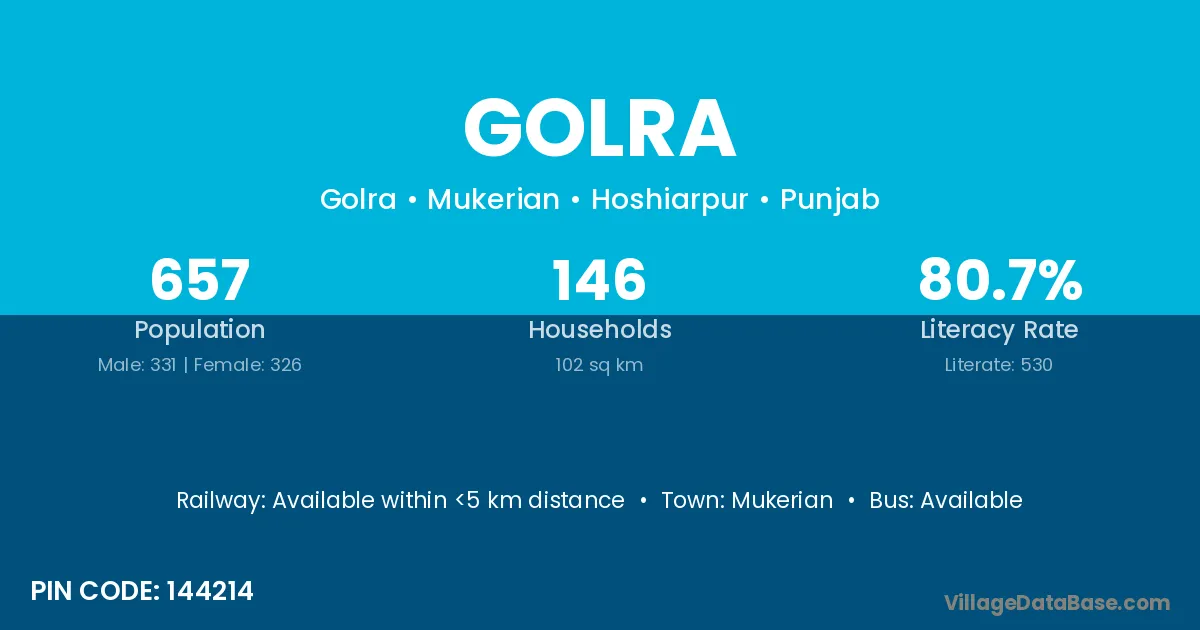 Golra village has a total population of 657 people, of which 331 are males and 326 are females.