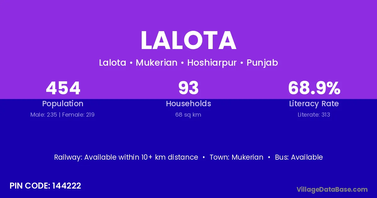 According to Census 2011 information, the village code of Lalota village is 144222.