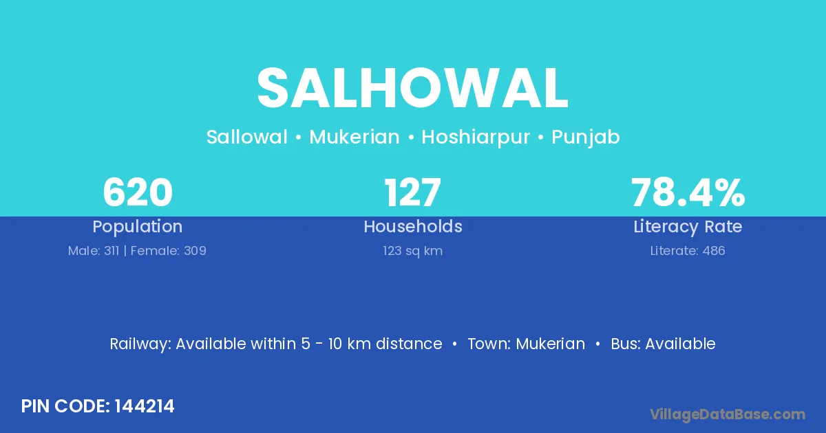 Salhowal village has a total population of 620 people, of which 311 are males and 309 are females.