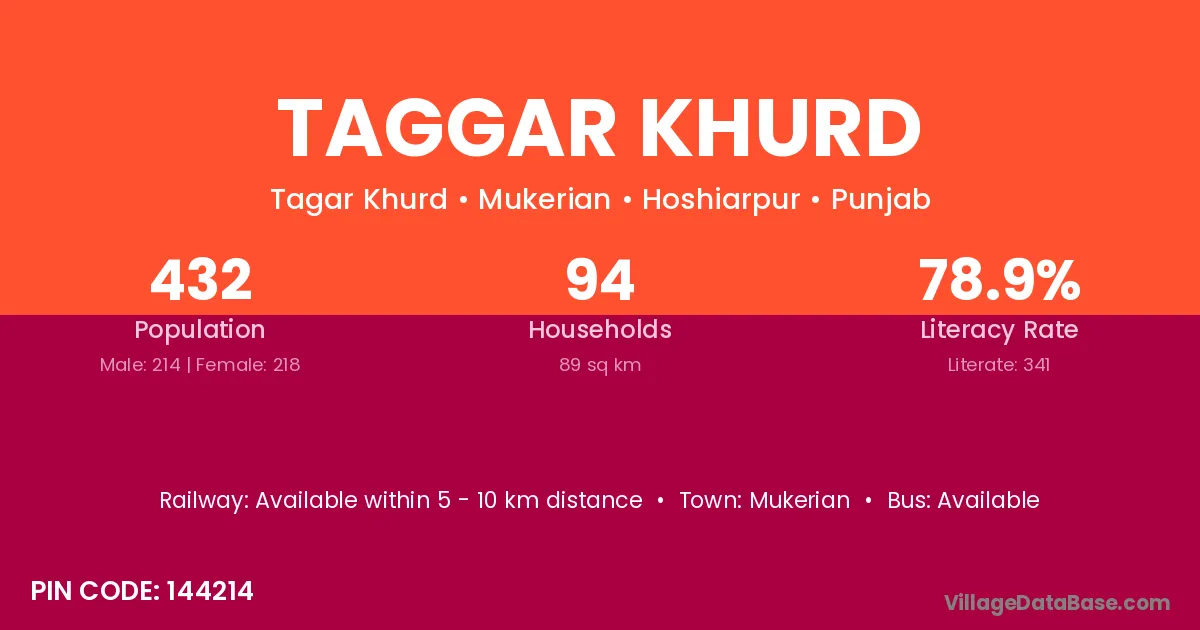 Taggar Khurd village has a total population of 432 people, of which 214 are males and 218 are females.