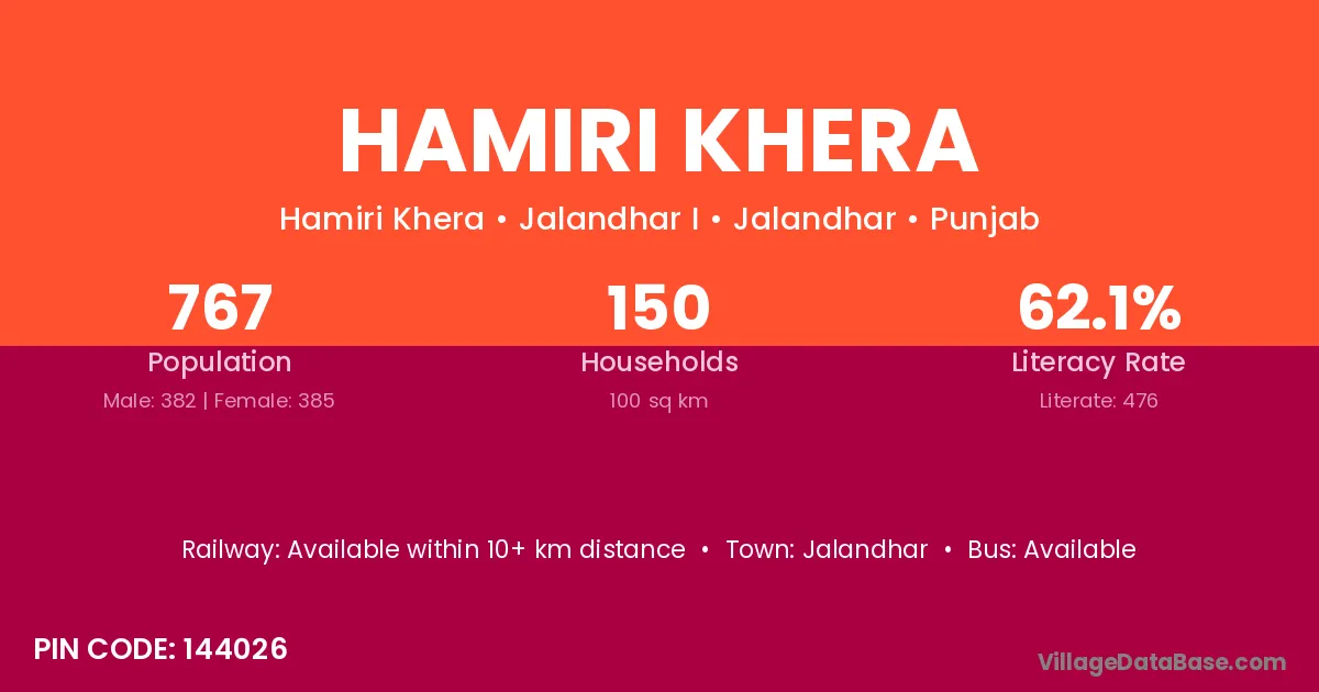 Hamiri Khera village has a total population of 767 people, of which 382 are males and 385 are females.