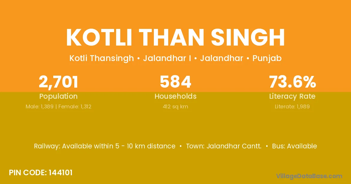 Kotli Than Singh village has a total population of 2,701 people, of which 1,389 are males and 1,312 are females.