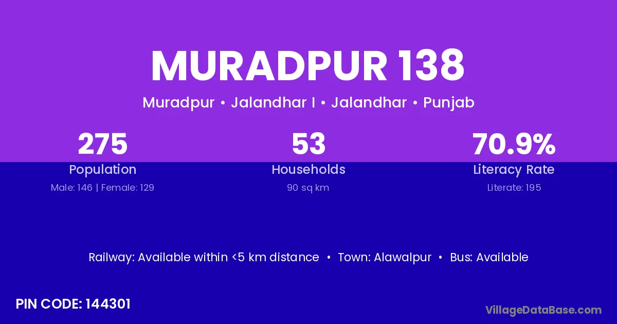 Muradpur 138 village has a total population of 275 people, of which 146 are males and 129 are females.