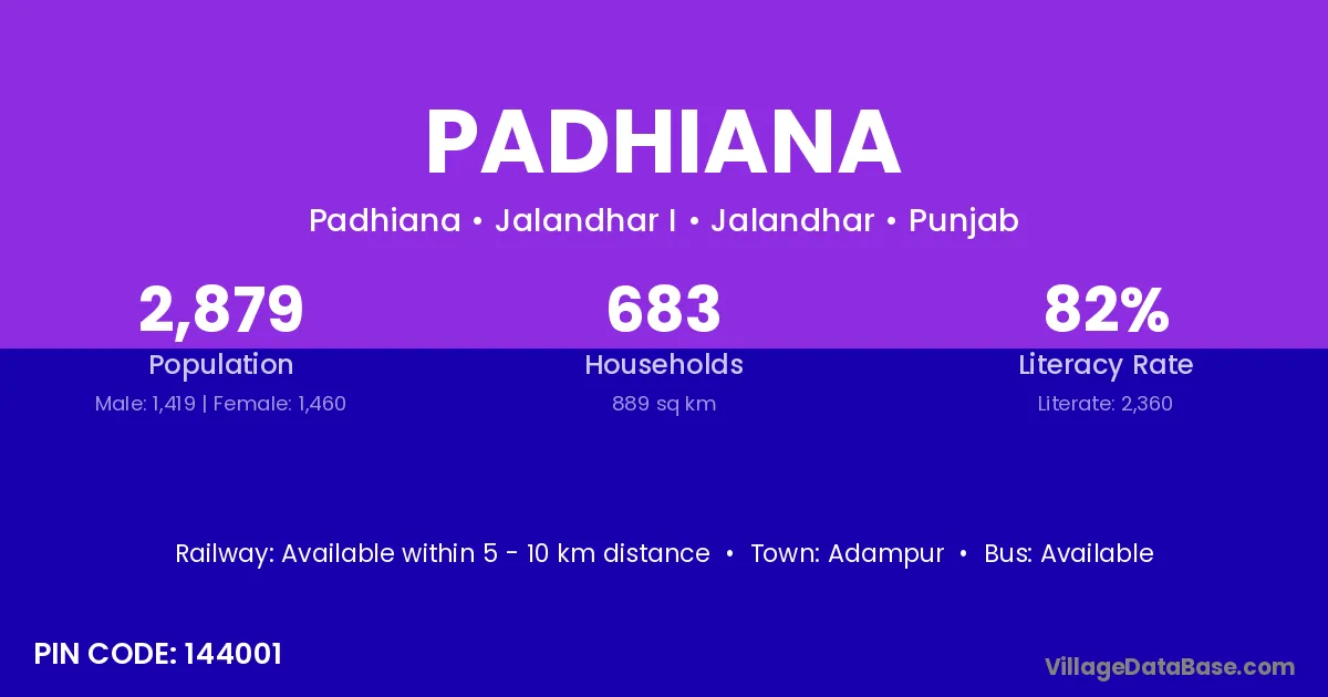 According to Census 2011 information, the village code of Padhiana village is 144001.
