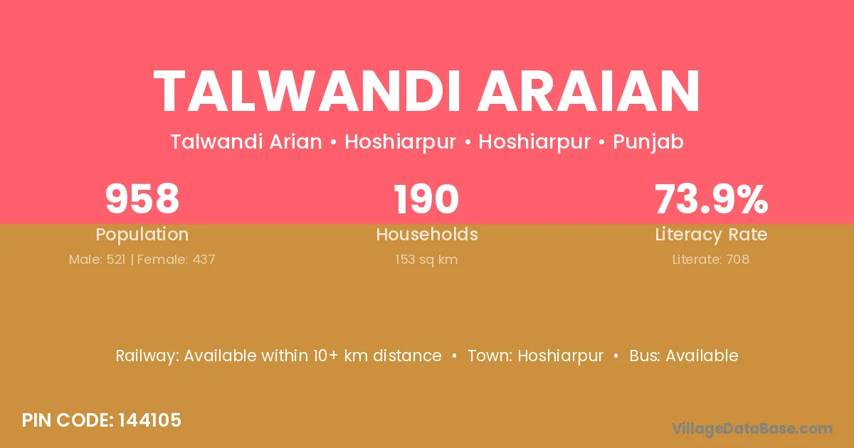 According to Census 2011 information, the village code of Talwandi Araian village is 144102.