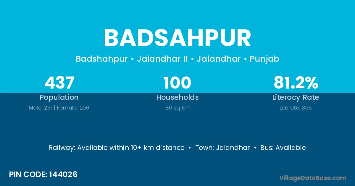 Badsahpur village has a total population of 437 people, of which 231 are males and 206 are females.