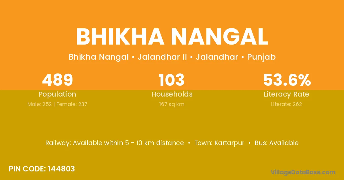 Bhikha Nangal village has a total population of 489 people, of which 252 are males and 237 are females.