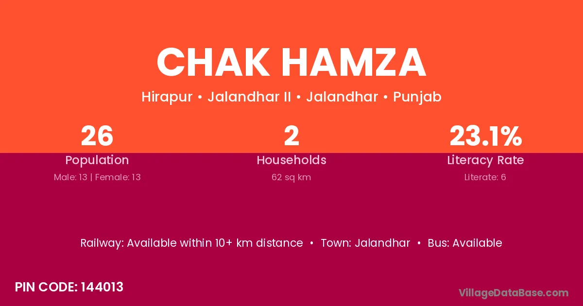 Chak Hamza village has a total population of 26 people, of which 13 are males and 13 are females.