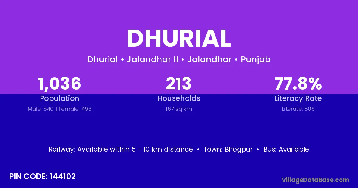 According to Census 2011 information, the village code of Dhurial village is 144102.