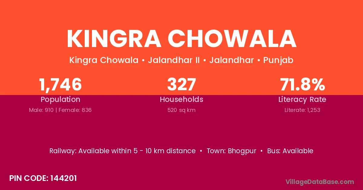 Kingra Chowala village has a total population of 1,746 people, of which 910 are males and 836 are females.