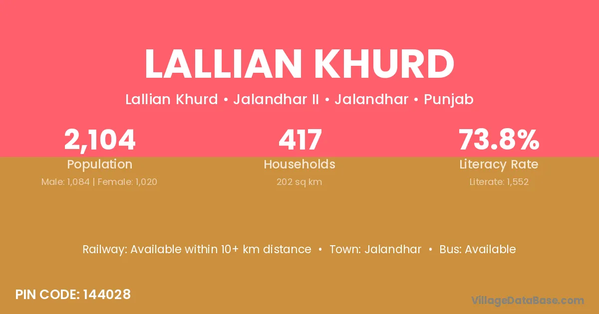 According to Census 2011 information, the village code of Lallian Khurd village is 144028.