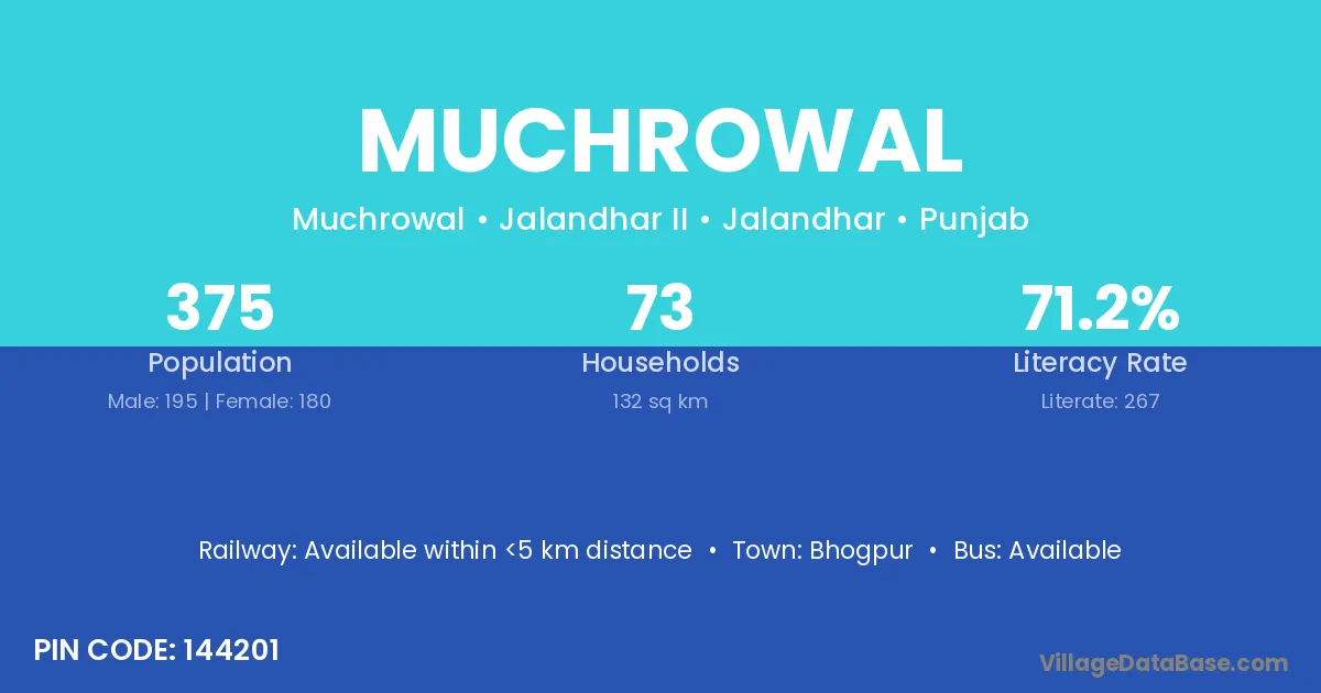 Muchrowal village has a total population of 375 people, of which 195 are males and 180 are females.