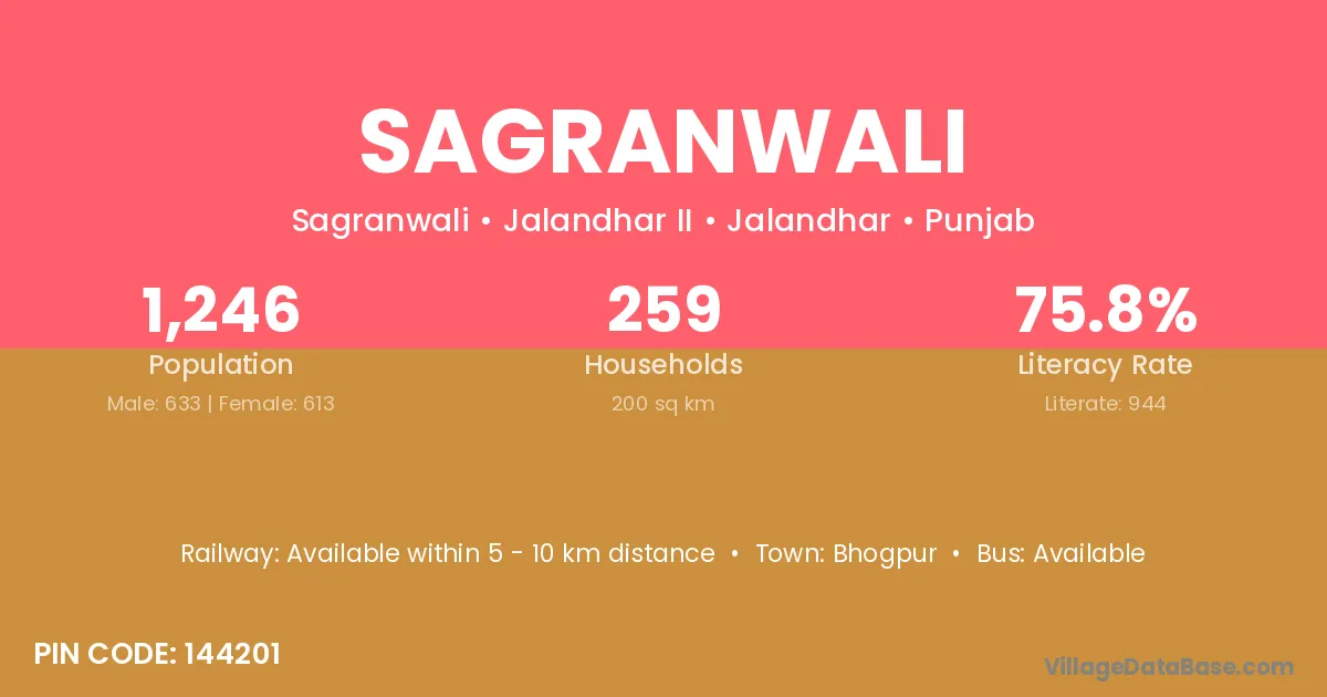 Sagranwali village has a total population of 1,246 people, of which 633 are males and 613 are females.