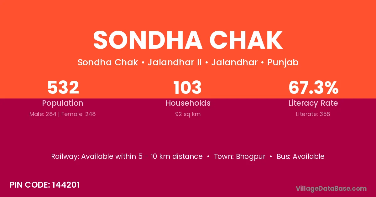 Sondha Chak village has a total population of 532 people, of which 284 are males and 248 are females.