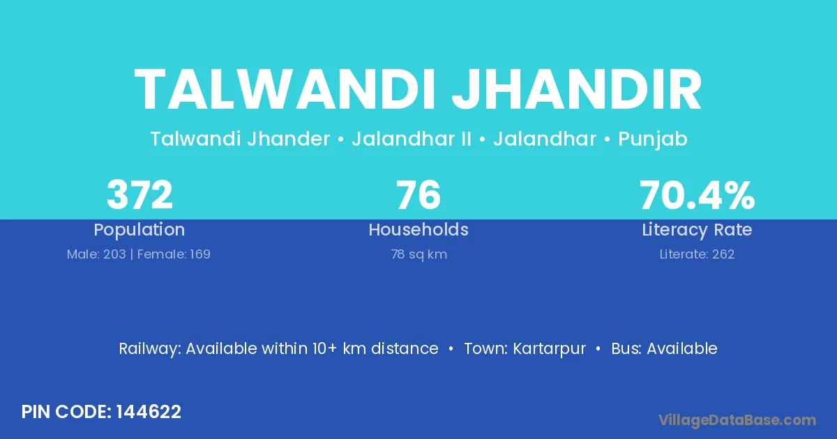 Talwandi Jhandir village has a total population of 372 people, of which 203 are males and 169 are females.