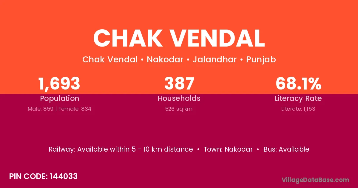 Chak Vendal village has a total population of 1,693 people, of which 859 are males and 834 are females.