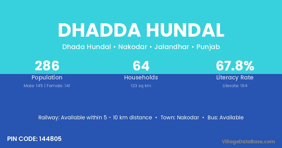 Dhadda Hundal village has a total population of 286 people, of which 145 are males and 141 are females.