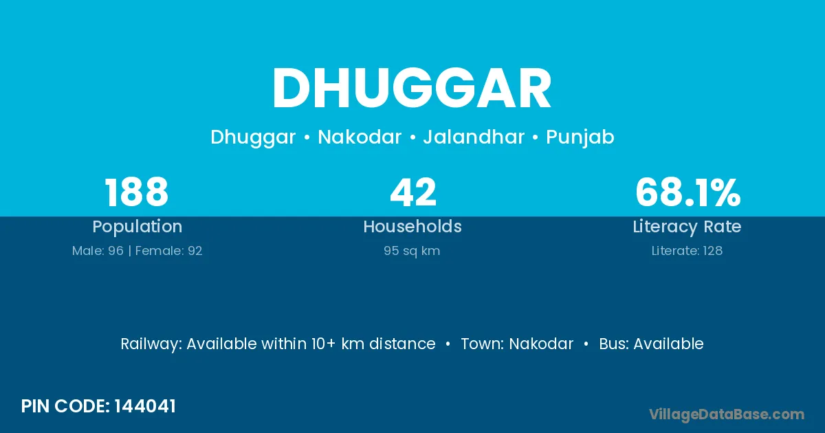 Dhuggar village has a total population of 188 people, of which 96 are males and 92 are females.