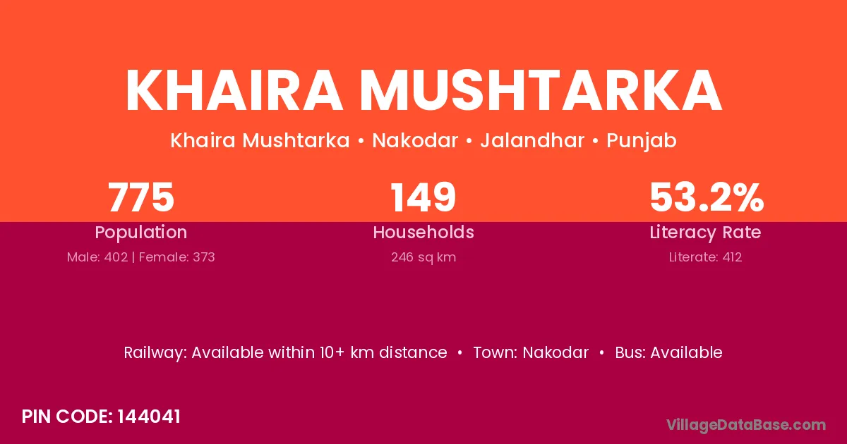 Khaira Mushtarka village has a total population of 775 people, of which 402 are males and 373 are females.