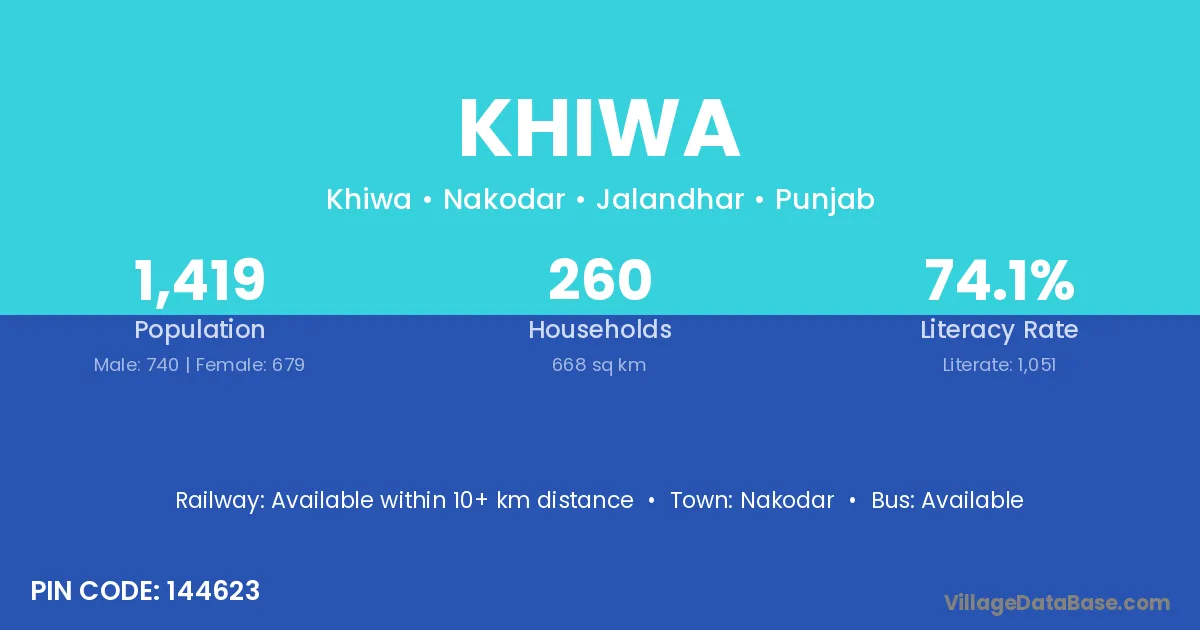 Khiwa village has a total population of 1,419 people, of which 740 are males and 679 are females.