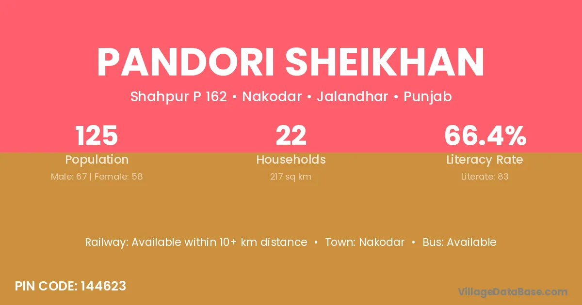 Pandori Sheikhan village has a total population of 125 people, of which 67 are males and 58 are females.