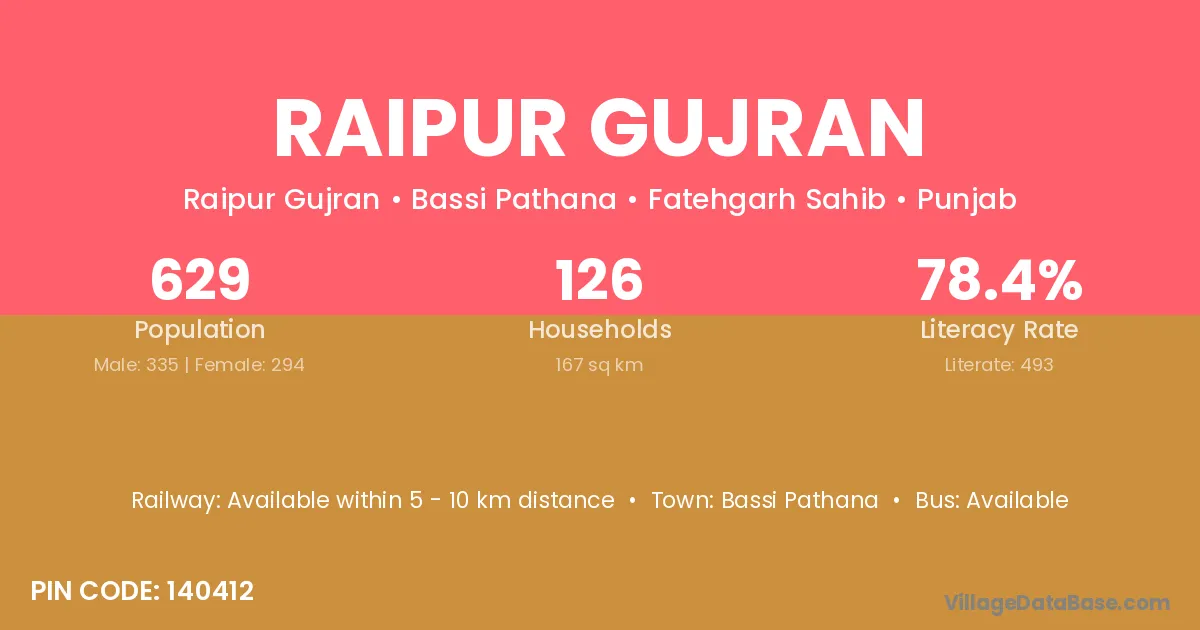 Raipur Gujran village has a total population of 596 people, of which 296 are males and 300 are females.