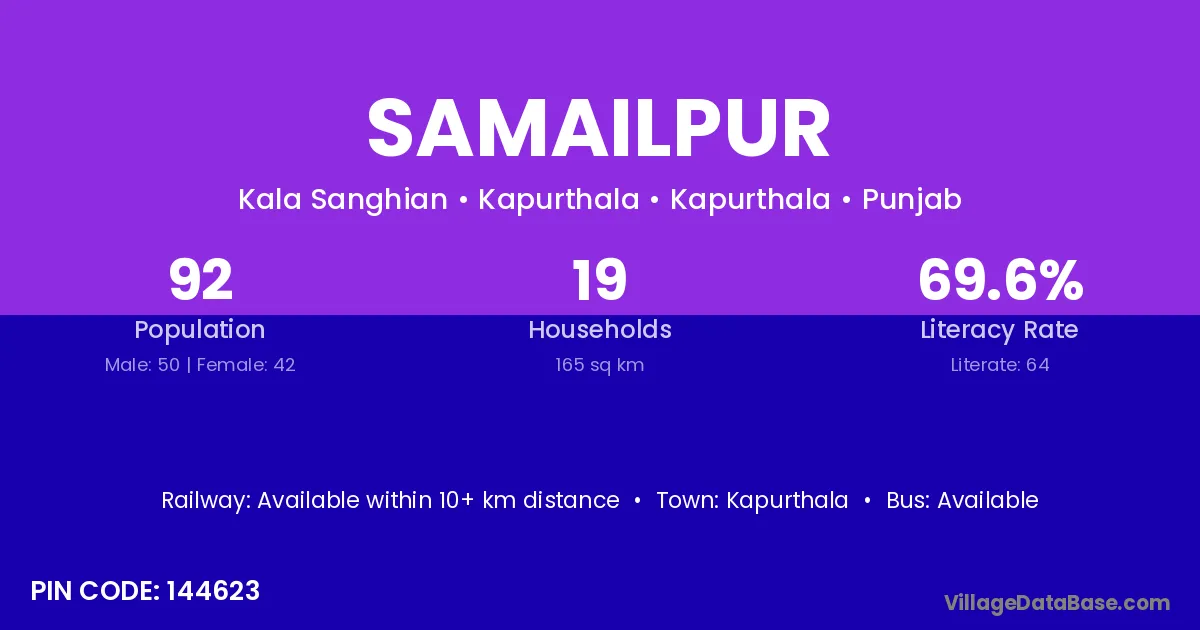 According to Census 2011 information, the village code of Samailpur village is 144041.