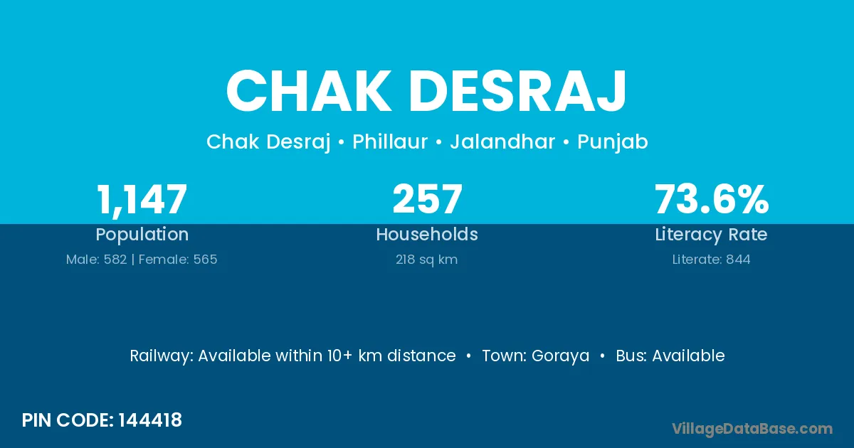 Chak Desraj village has a total population of 1,147 people, of which 582 are males and 565 are females.