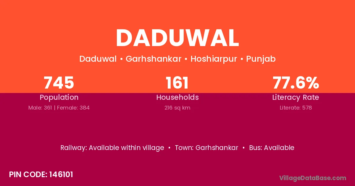 The literacy rate of Daduwal village is 68.99%. Male literacy stands at 72.27% and female literacy at 65.69%.