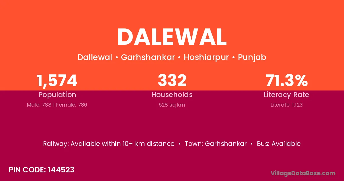 The literacy rate of Dalewal village is 72.61%. Male literacy stands at 73.52% and female literacy at 71.72%.